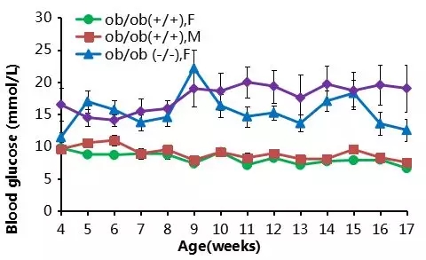 结果显示:纯合B-ob/ob小鼠(-/-)的血糖在4周龄时连续高于对照组。