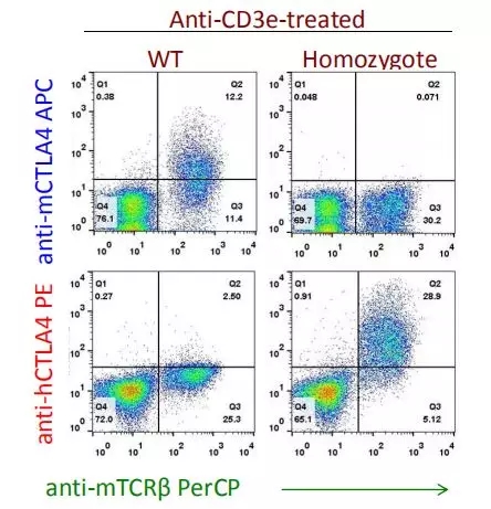 结果显示:在C57BL/6小鼠中可检测到mCTLA4细胞。在B-hCTLA4/hOX40纯合鼠中,可检测到hCTLA4细胞。