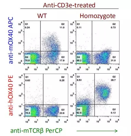 结果显示:在C57BL/6小鼠中可检测到mOX40+细胞。在B-hCTLA4/hOX40纯合鼠中,可检测到hOX40+细胞。