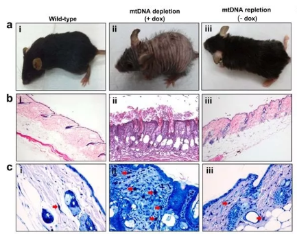 文章中的图9a-c。在线粒体DNA的量被恢复到正常水平之后小鼠和其皮肤细胞的图像。(“i”为野生型对照)。本研究用到的线粒体DNA缺失小鼠模型还可以用来快速鉴定线粒体DNA有关的疾病基因和通路。此外,这一动物模型有望在不同的器官的特定组织内改变线粒体DNA水平,因此或许可被用于研究线粒体在体内衰老过程或者其他线粒体相关疾病中的作用。该小鼠模型为通过增强线粒体功能来防治与衰老相关皮肤和头发问题(例如皱纹、脱发、炎症等),以及其他线粒体功能障碍相关疾病药物的开发提供了一个前所未有的机会。摘要:Mitochondrial DNA (mtDNA) depletion is involved in mtDNA depletion syndromes, mitochondrial diseases, aging and aging-associated chronic diseases, and other human pathologies. To evaluate the consequences of depletion of mtDNA in the whole animal, we created an inducible mtDNA-depleter mouse expressing, in the polymerase domain of POLG1, a dominant-negative mutation to induce depletion of mtDNA in various tissues. These mice showed reduced mtDNA content, reduced mitochondrial gene expression, and instability of supercomplexes involved in oxidative phosphorylation (OXPHOS) resulting in reduced OXPHOS enzymatic activities. We demonstrate that ubiquitous depletion of mtDNA in mice leads to predominant and profound effects on the skin resulting in wrinkles and visual hair loss with an increased number of dysfunctional hair follicles and inflammatory responses. Development of skin wrinkle was associated with the significant epidermal hyperplasia, hyperkeratosis, increased expression of matrix metalloproteinases, and decreased expression of matrix metalloproteinase inhibitor TIMP1. We also discovered markedly increased skin inflammation that appears to be a contributing factor in skin pathology. Histopathologic analyses revealed dysfunctional hair follicles. mtDNA-depleter mice also show changes in expression of aging-associated markers including IGF1R, KLOTHO, VEGF, and MRPS5. mtDNA-repleter mice showed that, by turning off the mutant POLG1 transgene expression, mitochondrial function, as well as the skin and hair pathology, is reversed to wild-type level. To our knowledge that restoration of mitochondrial functions can reverse the skin and hair pathology is unprecedented.阅读论文原文,请访问https://www.nature.com/articles/s41419-018-0765-9?utm_source=Other_website&utm_medium=Social_media_organicWebsite_links&utm_content=CelZha-Nature-Cell_Death_and_Disease-Biology-China&utm_campaign=NROAAJ_USG_JRCN_CZ_CDDIS