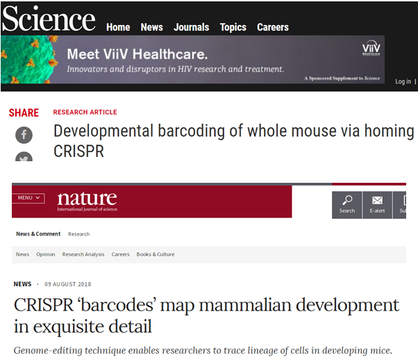 Researchers have used gene-editing to track the cell-by-cell development of a mouse embryo.Credit: Agnieszka Jedrusik and Magdalena Zernicka-Goetz, Gurdon Institute.8月9日,这项重磅成果以“Developmental barcoding of whole mouse via homing CRISPR”为题发表在《Science》杂志,并于同日得到《Nature》杂志特别报道。