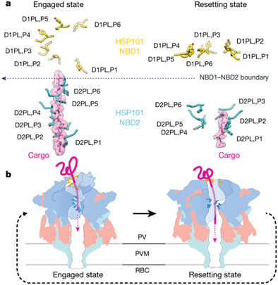 疟疾是一种传染病,通过被疟原虫感染的蚊子叮咬传播给人们。它每年影响2亿多人,而且每年导致近50万人死亡。当被蚊子叮咬时,疟原虫入侵人红细胞,获取红细胞膜的一部分,并在它的自身周围形成一种保护性的区室,即液泡(vacuole)。正常的红细胞过于简单而无法提供足够的营养物来支持活跃生长的疟原虫。侵入红细胞中的每个疟原虫就像是生活在一个空仓库中,必需产生数百种疟原虫“效应”蛋白将红细胞重塑为一个适合生长的家。疟原虫输出蛋白转运体(Plasmodium translocon of exported proteins, PTEX)是将这些疟原虫蛋白运输到红细胞中的蛋白复合物。PTEX起着门卫的作用;若没有它,这些效应蛋白就会被困在液泡中。但是迄今为止,科学家们并不知道PTEX如何参与将这些蛋白运输到红细胞中。