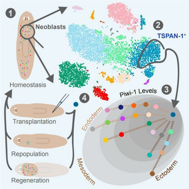 早在几十年前,研究人员就已经知道帮助涡虫再生的是一组被称为 neoblast 的非特异性干细胞,但具体是哪一种 neoblast 细胞发挥作用却不得而知。发育生物学家 Alejandro Sánchez Alvarado 就职于密苏里州堪萨斯城 Stowers 医学研究所,他最近利用新技术分离了单个细胞并鉴定了其基因活性。 这让他和同事们得以将该类再生细胞缩小到 12 个候选类型内。其中,一种 neoblast 细胞表面有一种特殊的蛋白质,这种蛋白质与名为四跨膜蛋白(tetraspanin)的细胞表面分子很相似,而四跨膜蛋白被认为与人类癌症有关—— 它们会让肿瘤细胞发展到身体其他部位。研究人员在涡虫四跨膜蛋白打上荧光标签,成功分离出这种被称为 neoblast 2 号亚型(Nb2)的细胞类型,以便进一步检测。 该研究小组 6 月 14 日在 Cell 报告中说,他们切割涡虫并观察伤口发展时发现 Nb2 细胞数量迅速增加。 这些细胞愈合了涡虫身上由于切割造成的伤口。 在另一个实验中,接受了致死量辐射的涡虫被注射单个 Nb2 细胞,这个 Nb2 细胞得以大量繁殖分化来拯救濒死涡虫。Nb2 细胞是一种特殊类型的干细胞。 在其他生物体中,只有发育中的胚胎的第一批细胞(称为全能细胞)能够形成所有身体组织。 其后的生命中,人类和其他动物的干细胞就只能形成有限的细胞类型(称为多能细胞)或单一细胞类型。 Sánchez Alvarado 解释说: “涡虫用某种我们不知道的方式保留了能形成任何组织的全能细胞。”
