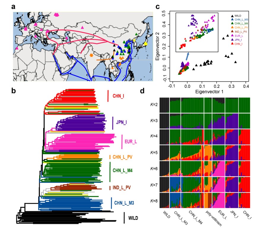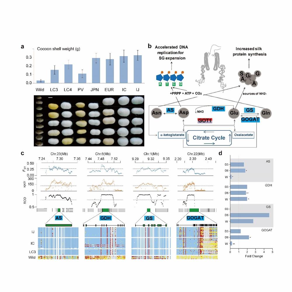 7月2日,《Nature》子刊《Nature Ecology and Evolution》(自然?生态学与进化)在线发表了题为“The evolutionary road from wild moth to domestic silkworm (从野蚕到家蚕的进化之路)”的研究论文(https://www.nature.com/articles/s41559-018-0593-4)。古代“丝绸之路”,是以蚕丝贸易为载体和符号,联系中西方经济及文化交流的交通要道。在丝绸之路的经济和文化传播过程中,蚕丝的生产者——家蚕,随之传播到亚欧各地,并经历近代育种后,形成现今丰富的地方与改良品种。然而,到目前为止,人们对丝绸之路的了解仍主要局限于文化、史料等层面,缺乏更深入的证据。另一方面,作为唯一完全驯化的昆虫,其驯化历史及其重要性状的人工选择机制的揭示,将对全面理解人工选择机制这一自达尔文以来长期悬而未决的重大科学问题,提供独特的证据和线索。该研究从中国、欧洲、日本和印度收集了137种不同品种的家蚕进行分析,确定家蚕是在5000年前从中国野桑蚕祖先单一驯化而来,驯化后三眠品系是最先分化的一个组,然后家蚕在连接中国、南亚和欧洲的古丝绸之路沿路上曾出现过几次扩散,并随后在中国和日本形成了特有的优良品种。研究通过人工选择信号分析,发现氮营养尤其是氨基酸代谢对于家蚕进化过程中茧丝量的提升发挥着重要作用;生物钟节律基因对于家蚕驯化及地方适应性具有一定的作用。利用大规模基因组数据资源,该研究还首次将全基因组联合分析(GWAS)应用于家蚕重要性状的定位,证实了该方法的可行性和科学性,并对一些重要抗性位点进行了定位。这些结果为家蚕育种及功能基因组学研究提供了系统的数据资源和参考依据,为后续深入开展茧丝生物学、节律分子机制等研究提供了重要线索。该研究是多个研究小组共同合作研究取得的成果。论文以华南师范大学生命科学学院暨中科院昆明动物所相辉教授,上海植物生理生态研究所博士生刘晓静,江苏科技大学李木旺研究员为共同第一作者,中科院上海植物生态研究所詹帅研究员、中国科学院昆明动物研究所王文研究员、江苏科技大学徐安英研究员为共同通讯作者。王文研究员的研究生朱亚楠和刘力源参与了本工作。该研究成果得到了科技部“973计划”项目、国家自然科学基金委等项目的资助。