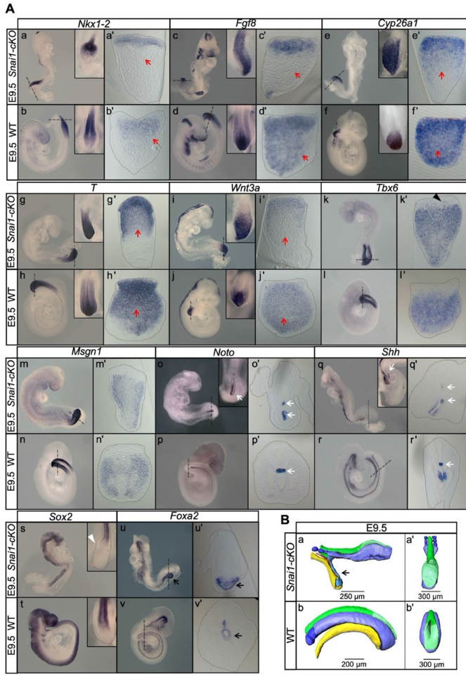 Dias A等人将Snai1flox/flox小鼠与Meox2-Cre杂交,产生外胚层特异性Snai1敲除小鼠。研究结果表明,E9.5时,Snai1-cKO(Meox2-Cre+/0;Snai1flox/−)胚胎小于WT小鼠胚胎,Snai1-cKO胚胎的尾芽被胚胎躯干区域尾部突出的突起所取代,该突起由一个上皮样层组成,该层向后延伸至躯干神经管(图4)。以上结果表明,Snai1是轴向祖细胞形成尾芽所必需基因[2]。