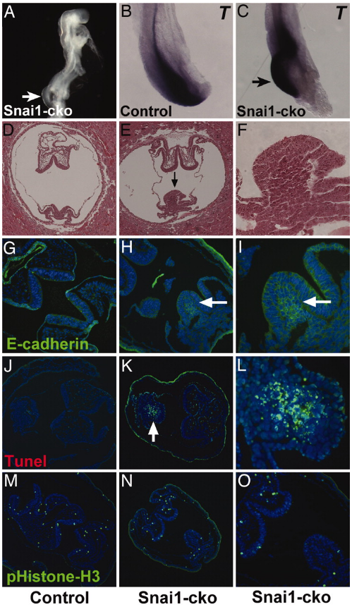 图注:A~C:E8.5 时 Snai1-cKO胚胎后部形态的缺陷,在后部原始条纹中观察到一个突出的凸起; B、C:T基因的整体原位杂交以观察中胚层形貌。D~F: 对照(D)和Snai1-KO(E和F)胚胎横切面的苏木精和伊红染色。G-I:对照和突变胚胎的E-钙粘蛋白免疫荧光显示E-钙粘蛋白表达(箭头)保留在原始条纹区域。J-L:TUNEL染色表明突变胚胎凸出的原始条纹区域中新生中胚层的广泛凋亡(K中的箭头)。M-O:通过磷酸组蛋白H3免疫染色鉴定的有丝分裂细胞,表明Snai1-cKO胚胎的增殖水平正常。