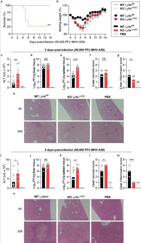 图注:ab:雌性Ly6eflox/flox和Ly6e△HSC小鼠注射PBS或MHV后的存活率(a)和体重减轻情况(b);c~n:感染后3(c~h)或5(i~n)天血清中ALT(c,i)、肝脏(d,j)和脾脏(e,k)中的病毒滴度以及肝坏死和炎症(fh,In)。