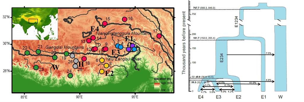 近日,昆明动物研究所、中科院动物进化与遗传前沿交叉卓越创新中心车静研究员与张亚平院士、加州大学伯克利分校David Wake院士等7个国内外团队的合作研究成果发表在国际知名期刊《美国科学院院报》(Proceedings of the National Academy of Sciences of the United States of America)(http://www.pnas.org/content/early/2018/05/11/1716257115)。研究揭示了高原极端环境条件下物种形成、群体分化的遗传学基础,并探讨了选择和适应在物种形成过程中的重要作用。车静课题组长期活跃在青藏高原,致力于探索高原极端环境下两栖爬行动物物种的形成演化、极端环境适应的进化遗传基础等重要问题。2014年,课题组报道了青藏高原特有两栖类——高山倭蛙线粒体谱系分化(Zhou et al., 2014),发现存在明显的地理结构,如东、西两个主要支系,其中东部支系内存在一定的高低海拔分化情况。此外,课题组通过对高山倭蛙微卫星数据分析与线粒体比较结果以及参考国内其他课题组(如Liu et al., 2015)的相关报道,发现在线粒体东、西支系的交界处存在基因渐渗情况。随后,通过与国内外多个学科组合作,成功解析了高山倭蛙的基因组(Sun et al., 2015),该基因组为后续研究该物种群体分化及高原适应性提供了重要基础。本项研究在前期基础上选取了高山倭蛙分布范围内63个居群样品进行了全基因组重测序,数据分析发现:1)东、西群体基因组中大部分区域已经出现明显隔离且不能发生基因渗透,支持两个物种的分化。目前研究支持二者交界处的一条狭长河谷为杂交带区域。通过对杂交带的基因组分析显示,东、西之间仅存在有限的基因交流,且杂交渗透片段短,随机散布在整个基因组中,渗透区域无明显的选择信号,提示可能发生了一次较为古老的基因交流。对东、西基因组高分化区域的分析发现与生殖相关的基因发生了显著富集。以上结果均提示高山倭蛙东、西居群之间已存在遗传上的生殖隔离,应为两个不同的物种,进一步分析提示选择作用在物种形成过程中扮演了重要角色;