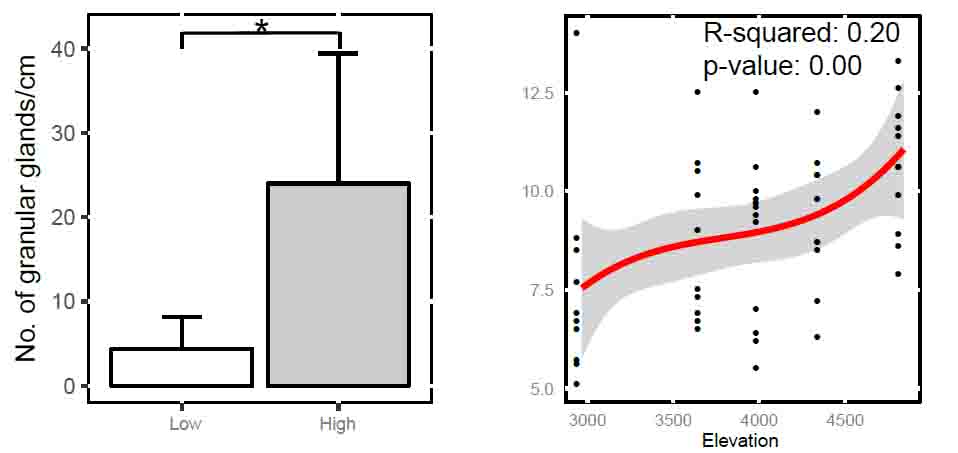 图注:东部高、低海拔个体皮肤颗粒腺含量(左图)和外周血血红蛋白浓度比较(右图)昆明动物所王国栋研究员和博士生张宝林为本文的共同第一作者,车静研究员、张亚平院士和David B. Wake院士为本文的共同通讯作者。该研究得到了中国科学院战略性先导科技专项(B类),国家自然科学基金重大研究计划培育项目及中科院青年创新促进会等项目的支持。参考文献:1. Zhou WW, et al. (2014) DNA barcodes and species distribution models evaluate threats of global climate changes to genetic diversity: A case study from Nanorana parkeri (Anura: Dicroglossidae). PLoS One 9:e103899.2. Liu J, et al. (2015) Phylogeography of Nanorana parkeri (Anura: Ranidae) and multiple refugia on the Tibetan Plateau revealed by mitochondrial and nuclear DNA. Sci Rep 5:9857.3. Sun YB, et al. (2015) Whole-genome sequence of the Tibetan frog Nanorana parkeri and the comparative evolution of tetrapod genomes. Proc Natl Acad Sci USA 112: E1257–E1262.