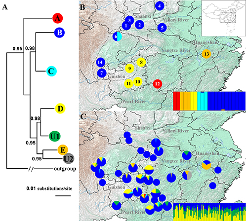 基于线粒体片段、简化基因组SNP、微卫星数据获得的中国大鲵系统发育关系和遗传结构。A. 基于线粒体基因片段,构建的野生种群(A-E)及4个养殖个体(UI, U2)构建的系统发育关系。B. 野生种群的分布点;饼图颜色对应图A中线粒体支系;右下角为基于简化基因组SNP数据的群体结构(最适K=5),颜色对应线粒体支系。C. 养殖种群的样品采集点;饼图颜色对应A中线粒体支系;右下角为基于微卫星数据的群体结构(最适K=1,这里显示第二最适K=3)。