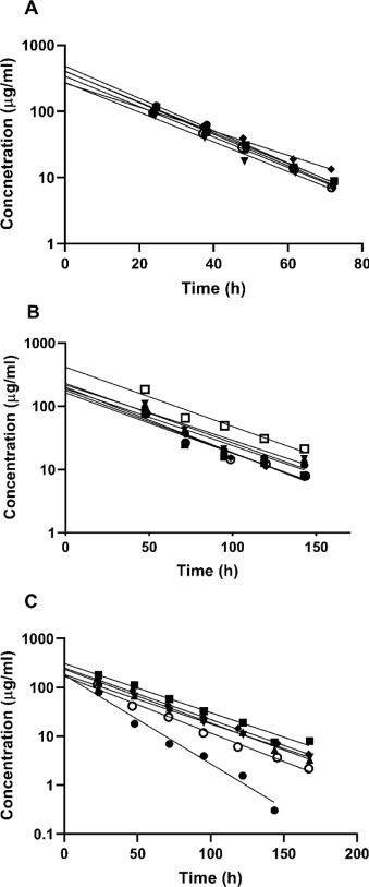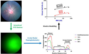 对数线性图显示玻璃体内化合物的消除遵循一级动力学。每条拟合线显示一只眼睛的消除曲线。消除半衰期的范围从几个小时(荧光素)到大约一周(FITC葡聚糖157和500 kDa)。表观分布容积(1.2~2.6ml)在兔玻璃体解剖容积范围内(≈1.7ml)。FITC-葡聚糖500 kDa的平均消除半衰期和清除率分别为FITC-葡聚糖10 kDa的183%和27%。文献中获得的FITC-葡聚糖157kda(166h)的消除半衰期与本研究中的FITC-葡聚糖500kda(152h)相似。