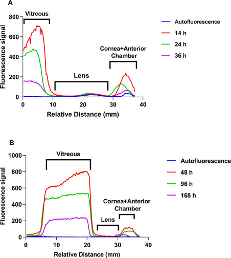 图2、向大鼠(a)和兔(B)玻璃体内注射FITC葡聚糖10 kDa之前(自体荧光)和之后的荧光光度扫描示例。颜色表示注射后扫描的不同时间。