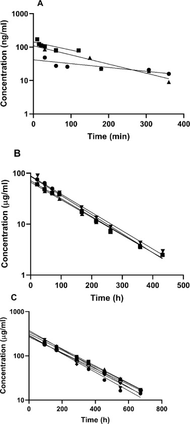 图4、玻璃体内注射的浓度-时间曲线。A)荧光素,B)FITC-葡聚糖10kDa和C)FITC-葡聚糖500kDa