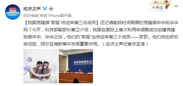 【我国克隆猴“家庭”将迎来第三名成员】还记得前段时间刷屏的克隆猴中中和华华吗?今天(2月11日),科技部副部长黄卫介绍,我国在国际上首次利用体细胞成功创建克隆猕猴中中、华华之后,他们的“家庭”也将迎来第三个成员——梦梦。他们将在研究自闭症、阿尔兹海默症等中发挥重要作用。