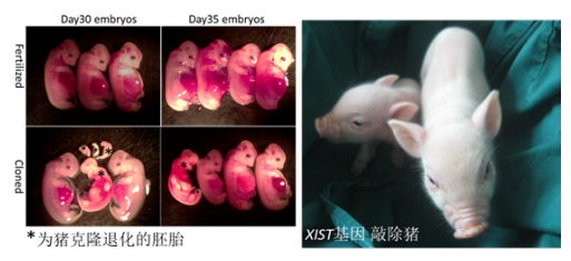 猪克隆退化的胚胎和 XIST 基因敲除猪近日,中国科学院广州生物医药与健康研究院赖良学课题组的最新研究成果,以 XIST Derepression in Active X Chromosome Hinders Pig Somatic Cell Nuclear Transfer 为题,在线发表在 STEM CELL REPORTS(《干细胞报告》)上。该研究首次探讨了 X 染色体上长链非编码 RNA XIST 和组蛋白 H3K9me 对猪体细胞克隆胚胎发育的影响,并对其在克隆胚胎中表达水平加以干预,大幅提高猪的克隆效率。自克隆羊“多莉”产生,克隆技术历经几十年的发展,但包括猪在内的大动物克隆效率仍然十分低下。赖良学研究组在多年的克隆猪研究中发现,猪克隆胚胎移植到代孕母体后,大部分胎儿都会发生退化,其机制目前尚不清楚。课题组阮德功博士等从分析正常发育的胎儿和退化吸收的胎儿的表达谱入手,发现猪的克隆胚胎的基因表达谱与小鼠明显不同,小鼠克隆胚胎基因下调主要出现在 X 染色体,而猪的克隆胚胎的基因下调发生在所有染色体上。研究人员通过基因编辑技术,定点失活 XIST 基因,可以拯救下调的基因,从而提高猪克隆胚胎的体外发育质量和体内发育的潜能,将猪的克隆效率提高约 7 倍。研究进一步发现,XIST 敲除克隆胚胎的发育能力提高与胚胎中组蛋白 H3K9me3 的水平有密切关系。研究人员主动下调克隆胚胎中 H3K9me3 水平,同样可以显著地提高猪早期克隆胚胎发育效率,但主动下调 H3K9me3 水平会解除其对 XIST 的抑制作用,诱导 XIST 基因在克隆胚胎中的异常高表达,因此,通过向猪克隆胚胎中注射 H3K9me3 去甲基化酶来下调 H3K9me3 水平,并不能像小鼠那样提高克隆效率,反而导致猪克隆胚胎在体内发育能力变低。该研究成果在一定程度上解析了猪体细胞克隆过程的一些特有机制,为提高猪的克隆效率提供了新思路。研究工作获得国家自然科学基金、中科院国际合作重点项目、广东省科技计划项目和广州市科学(技术)研究专项等的支持。