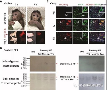 基于实验室之前的研究,同源臂介导的末端接合(HMEJ)的方法可以有效地在猕猴胚胎上实现高效的靶向基因整合。研究人员进一步优化受精卵注入条件,包括供体质粒浓度以及注射剂量,期望在提高敲入效率的同时保持正常的胚胎发育,进而获得基因敲入的猴子。具体来说,研究人员在Actb (β-actin) 位点插入p2A-mCherry以实现mCherry在Actb启动子的控制下表达。在经历完整的怀孕周期后,研究人员成功地获得了一对双胞胎猴(#1,雄;#2,雌)和三只单胎的雌性猴 (#3、#4和#5)。通过直接表皮荧光观察两只新生猴(#1,#5)的脚趾发现,与野生型相比,#1和#5展现出mCherry荧光。对两只死亡雌猴子(#2,#3)的各个组织进行切片观察,发现尾巴、脚趾、心脏、肌肉、心脏、肾、大脑和卵巢均显示出不同嵌合程度的mCherry表达。值得注意的是,研究人员在卵巢的大部分区域都检测到mCherry的表达,说明基因敲入猴子具有生殖系传递的可能性。所有组织的PCR鉴定测序结果都表明在5’和3’连接处的整合是正确的。此外,Southern印迹分析进一步证实# 2和# 3猴的基因整合是正确的且没有额外的基因随机整合。