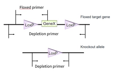 我们以基因敲除为例,介绍Cre-Lox小鼠的相关鉴定。首先需要鉴定小鼠是否为目标基因型。cKO小鼠的目标基因型是Cre/+; flox/flox, 此时同时使用原始Cre品系和floxed品系的基因型鉴定方法即可。需要注意的是,如果使用了全身表达Cre,则需重新设计floxed基因敲除后的引物方可实现鉴定。
