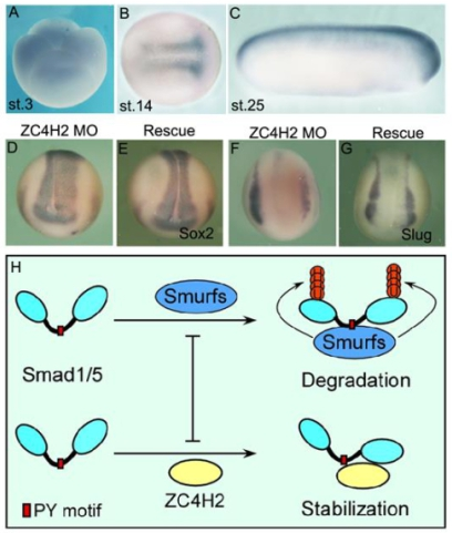 近日,中国科学院昆明动物研究所神经发育与进化研究组在 BMP 信号传导及脊椎动物早期神经发育研究中取得进展,首次揭示了脊椎动物中高度保守的小核蛋白 ZC4H2 调控 BMP 信号通路的分子机制及其在脊椎动物早期神经系统发育中的功能。该研究成果于 8 月 16 日在线发表在英国皇家学会官方生物学期刊 Open Biology 上。脊椎动物神经系统的发育包括神经诱导、图式形成以及神经分化三个主要过程。在脊椎动物早期胚胎发育的原肠运动后期,部分外胚层组织在 BMP 信号通路抑制性因子的作用下被诱导形成神经板,该过程即为神经诱导过程,是神经系统发育的起始。神经板组织经过后续的图式形成以及神经分化阶段最终形成复杂的神经系统。ZC4H2 是一个非常保守的小核蛋白,与人类神经系统相关疾病的发生密切相关,但关于其在神经系统发育中的功能一直未知。昆明动物所神经发育与进化学科组的研究发现:在非洲爪蛙的胚胎发育过程中,ZC4H2 是一个母源性表达的基因,随后在发育中的神经系统中特异表达。功能实验表明,ZC4H2 参与了非洲爪蛙早期胚胎神经诱导过程;且体内和体外的实验都证明,ZC4H2 可以正调控 BMP 信号通路。进一步的生化实验表明,ZC4H2 通过直接与 Smad1/ 5 蛋白相互作用,竞争性抑制了其与泛素连接酶 Smurf1/ 2 的结合,从而抑制了 Smad1/ 5 蛋白的泛素化降解途径进而促进了其蛋白稳定性。此外,在对人类神经系统相关疾病中鉴定出的 ZC4H2 的突变研究中发现,ZC4H2 可能是通过对 BMP 信号通路的调控参与了人类神经系统的发育过程。昆明动物所助理研究员马鹏程、昆明动物所与安徽大学联合培养硕士生任碧玉、昆明动物所博士研究生杨相彩为文章的共同第一作者,昆明动物所研究员毛炳宇和马鹏程为文章共同通讯作者。该项研究工作得到了国家自然科学基金委、中科院以及云南省的资助。http://rsob.royalsocietypublishing.org/content/7/8/170122 昆明动物所在BMP信号传导及脊椎动物早期神经发育研究中取得进展