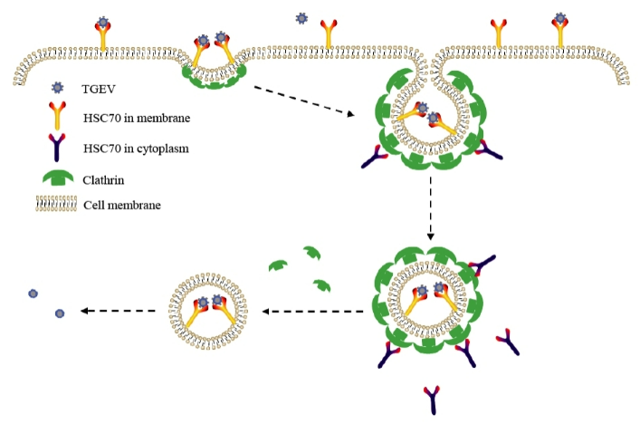 本研究利用蛋白质谱和免疫共沉淀技术发现了与病毒M互作的宿主膜蛋白——HSC70和Clathrin。HSC70是一种分子伴侣蛋白,在蛋白质聚集和分解Clathrin复合物方面可以发挥功能,参与调节多种病毒的生命周期。通过CRISPR-Cas9技术构建HSC70的基因敲除细胞系,发现该细胞系显著降低病毒的内化效率;利用M的多抗阻断M与HSC70的结合可以影响病毒的内化过程;进一步的研究证实Clathrin参与了TGEV的细胞内化过程,并与M和HSC70之间也存在相互作用,表明M-HSC70互作影响病毒的内化过程依赖于Clathrin介导的内吞作用。上述研究阐明了TGEV内化侵入细胞的一种新机制,拓宽和丰富了对冠状病毒TGEV细胞入侵方式的认识,获得了拮抗病毒入侵的新靶点,对抗病毒研究提供了新的思路。