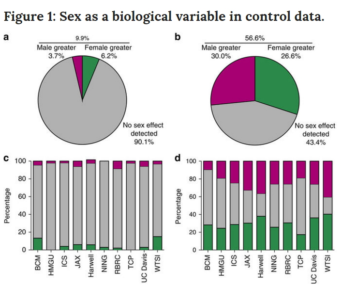 结果发现:对于在实验中用作对照组的正常实验鼠,性别差异影响着56.6%的可以量化的生理指标(例如骨密度等),以及9.9%的不可量化的生理指标(例如头部形状是否正常)。
