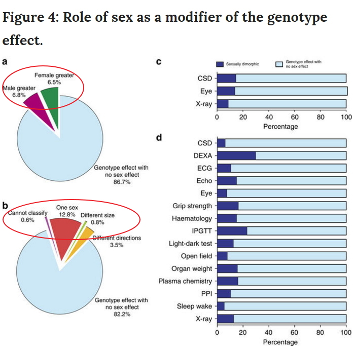 对于有一个存在基因突变的实验鼠,反映在生理指标上的效果也受性别差异影响,涉及13.3%的可以量化指标和17.7%的不可量化指标。