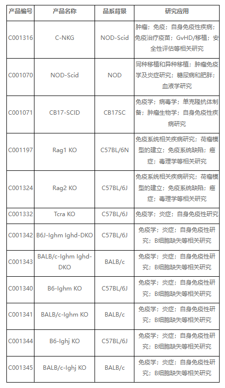 另外,除了自研的重度免疫缺陷小鼠C-NKG外,还有NOD-Scid、CB17-SCID、Rag1 KO、Rag2 KO、Tcra KO等多类型免疫缺陷小鼠模型,方便且高效,总有一款适合你。