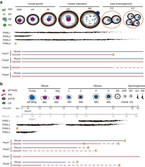 针对上述科学问题,科研人员分别制备和获得了四种PIWI蛋白的特异性抗体,结合超分辨共聚焦显微技术,全面分析了四种PIWI亚家族蛋白在金黄地鼠精子发生、卵子发生和早期胚胎发育中的时空表达特征,并结合高通量测序技术细致地描绘了不同发育时期中PIWI蛋白所结合的piRNA表达谱。进一步,研究利用CRISPR技术分别构建了四种PIWI缺失的金黄地鼠突变系,探讨了不同PIWI蛋白突变所引发的生殖缺陷表型。结果表明,PIWIL1同时在雌性和雄性生殖细胞及早期胚胎中高表达,主要结合29-30 nt piRNA,突变后导致雌雄均不可育:突变的生精细胞在进入双线期前发生大量死亡,部分可进入双线期的生精细胞随后发育停滞,而突变的卵母细胞可正常发育,但受精后胚胎发育停滞于2细胞时期。PIWIL2和PIWIL4主要在生精细胞中表达,但两者表达存在明显的时期特异性,且分别结合27 nt或28 nt piRNA。PIWIL2或PIWIL4突变后生精过程严重受阻,大量精原细胞凋亡,造成雄性不育。PIWIL3高表达于卵母细胞和早期胚胎中,结合19 nt的os-piRNA,突变后卵母细胞发育正常,但受精后的胚胎发育迟缓,且大部分在发育过程中停滞或凋亡,最终导致生育能力显著下降。