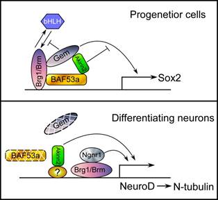 Akirin2通过参与不同的蛋白复合体参与了神经祖细胞维持以及神经分化过程的调控原文摘要:To ensure correct spatial and temporal patterning, embryos must maintain pluripotent cell populations and control when cells undergo commitment. The newly identified nucleoprotein Akirin has been shown to modulate the innate immune response through epigenetic regulation and to play important roles in other physiological processes, but its role in neural development remains unknown. Here, we show that Akirin2 is required for neural development in Xenopus and knockdown of Akirin2 expands the expression of the neural progenitor marker Sox2 and inhibits expression of the differentiated neuronal marker N-tubulin. Akirin2 acts antagonistically to Geminin, thus regulating Sox2 expression, and maintains the neural precursor state by participating in Brg1/Brm-associated factor (BAF) complex mediated by BAF53a. Additionally, Akirin2 also modulates N-tubulin expression by acting upstream of NeuroD and in parallel with Ngnr1 during terminal neuronal differentiation. Thus, our results reveal a novel model in which Akirin2 precisely coordinates and temporally controls Xenopus neural development.