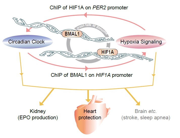 为了进一步解析这一重要现象的分子机理,研究人员综合运用了一系列的分子细胞生物学、生物信息学、基因组学包括ChIP-seq等实验手段,发现生物钟与低氧通路至少在两个层面有互作:在染色质水平上,HIF1A/BMAL1有协同激活下游基因转录的功能;在更上一层基因表达方面,CLOCK/BMAL1能够激活HIF1A基因的表达,而HIF1A又能激活另一核心钟基因PER2的表达。因此,除了前面描述的“生物钟调控低氧反应强度”之外,研究小组还证明,低氧信号的激活反过来会减慢生物钟的周期和降低其振幅。这一互作现象在同一期发表的另两篇文章中得到了体现和呼应(Peek et al和Adamovich et al, 2017)。