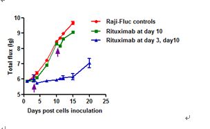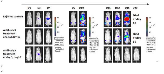 图3. 对B-NSG小鼠通过尾静脉注射相同数量( 5 × 105)的Raji-Fluc细胞,并在第3天以及第10天尾静脉注射相同计量的抗体X,之后在不同的时间点成像观察肿瘤生长状况。