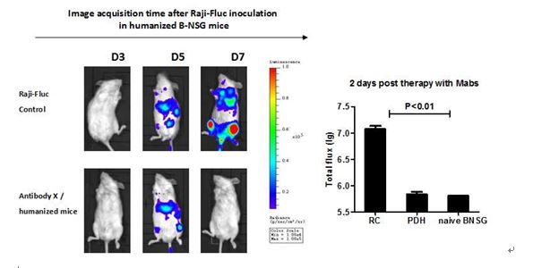 图4. 首先,在B-NSG小鼠上重建CD34+T细胞,静脉注射 5 × 105 Raji-Fluc细胞,5天后再给小鼠静脉注射人源PD-1抗体,2天后可见抗体对肿瘤细胞有明显的抑制作用。