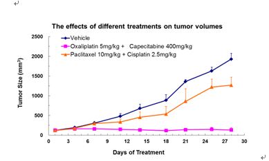 图2. 不同药物对同一种胃癌PDX模型药效试验效应不同。