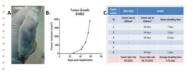 图1. A. 病人胃癌样品在B-NSG小鼠皮下接种并成瘤;B. 病人胃癌样品在B-NSG小鼠体内的肿瘤生长曲线; C. 病人胃癌样品在CB17-scid 和B-NSG小鼠体内的成瘤率比较。