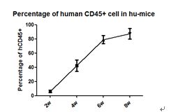 图3. B-NSG小鼠经过辐照,尾静脉接种2x105 CD34+细胞,流式分析统计,CD34+细胞重建B-NSG小鼠免疫系统后,人源细胞随时间变化曲线。