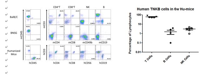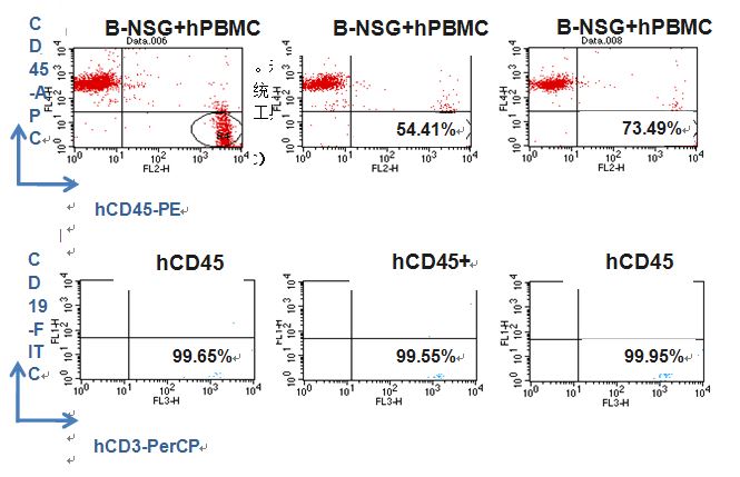 图1. 人外周血单个核细胞(hPBMCs, human pripheral blood mononuclear cells) 在B-NSG小鼠的成功接种。通过尾静脉注射5x106人外周血细胞(hPBMCs)进B-NSG小鼠,24天后取血流式检测hCD45+和mCD45+的比例。