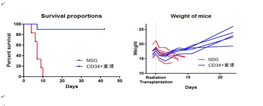 结果表明,重建的CD34+细胞有效延长了辐照后B-NSG小鼠的生存时间。