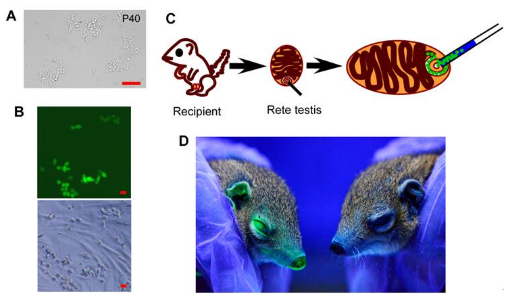 A. 培养40代的树鼩精原干细胞系;B. 稳定表达绿色荧光蛋白(GFP)的树鼩精原干细胞;C. 基因修饰精原干细胞移植到受体睾丸中;D. 左边为表达GFP的转基因树鼩。