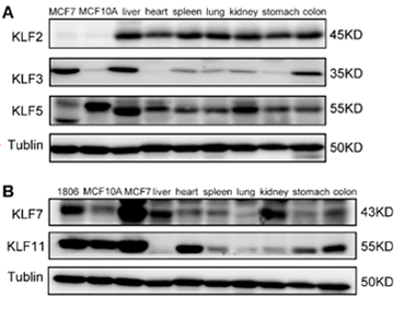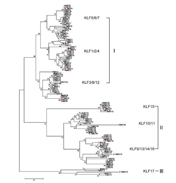 KLF基因家族是一类含有三个高度保守的串联锌指结构的转录因子家族,KLF因子调控基因的表达,在动物细胞的增殖、分化、衰老、死亡以及癌变中起着重要作用。前期研究发现KLF5在基底型乳腺癌干细胞维持中起着关键的作用。KLF家族在许多物种中得到鉴定,包括人类、小鼠、猪、鸡、斑马鱼、线虫等,但树鼩KLF基因家族的系统发生及表达谱还没有研究报道。