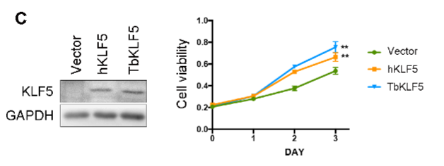 肿瘤生物学学科组研究发现,通过氨基酸全长进化树分析,树鼩17种KLF因子在物种间保守。树鼩高度保守的锌指结构与人有超过平均97%的同源性,略高于小鼠。锌指结构进化树分析发现,树鼩KLF1,2,5,17在进化地位上明显比小鼠更接近于人。对高度可变的N端功能基序的分析表明,树鼩KLF3,8,12有保守的CtBP结合序列PVDLS/T,树鼩KLF9,10,11包含保守的Sin3A结合序列AA/VXXL。核定位(NLS)序列比对发现,树鼩KLF1,4,8,13在N端拥有高度保守的NLS序列。通过RT-qPCR和WB揭示了树鼩KLF因子在不同组织中不同的表达模式。最后对树鼩KLF5序列单独分析发现,KLF5蛋白序列中存在重要的翻译后修饰位点,比如S153磷酸化位点,K369乙酰化位点,K162和K209 类泛素化(SUMO)化位点都在树鼩保守存在。泛素连接酶Fbw7以及WWP1识别的KLF5蛋白CPD和PY序列也同样严格保守,且树鼩KLF5与人类KLF5都具有促进细胞增殖的功能。该研究首次对树鼩KLF基因家族进行鉴定及分析,发现树鼩KLF基因家族在进化上较保守,比小鼠更接近于人。树鼩KLF蛋白结构与功能和人体中同源家族基因高度类似。研究结果为进一步以树鼩为疾病动物模型研究KLF家族因子与疾病的关系奠定了基础。