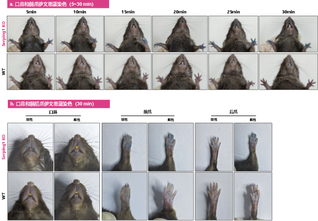 HAE的显著特征是血管通透性的增加,伊文思蓝(EB)是一种常用的体内血管通透性检测染料,能够量化血管渗漏程度并观察活体小鼠的血管通透性。在小鼠达到9周龄时,通过尾静脉注射EB并定时观察小鼠体内蓝色染料的分布情况。结果显示,随着时间的推移,Serping1 KO小鼠的口鼻、前爪和后爪的蓝色逐渐加深,而野生型小鼠的颜色基本无变化。这一结果表明,Serping1 KO小鼠的血管通透性明显增加。