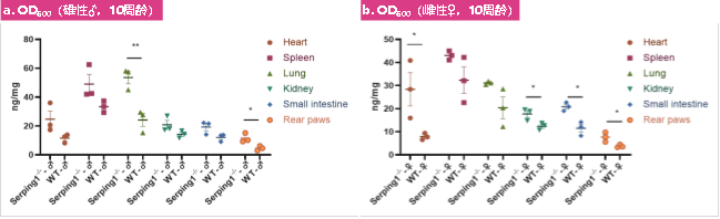 尾静脉注射EB染料30分钟后,处死小鼠,并对心脏、脾脏、肺部、肾脏、小肠和后爪等组织进行灌流取材和预处理。处理完成后,测量相应样本溶液的吸光度(OD)值以定量不同组织中的EB染料含量。结果显示,Serping1 KO小鼠各组织中都存在不同程度的EB染料渗出,这表明其血管通透性的增加导致了血管中的EB染料大量浸润到其他组织。
