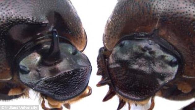 当在蜣螂身上关闭orthodenticle(otd)基因时,就会导致角的萎缩,并诱导生成第三只眼睛。图中右边是一只该基因关闭的蜣螂,左边是正常发育的蜣螂。 当在蜣螂身上关闭orthodenticle(otd)基因时,就会导致角的萎缩,并诱导生成第三只眼睛。图中右边是一只该基因关闭的蜣螂,左边是正常发育的蜣螂。