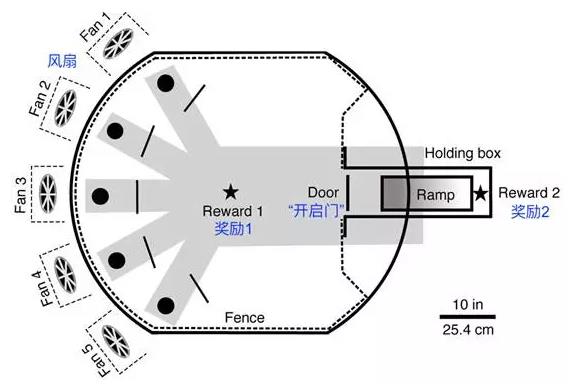 Yan Yu 和 Matthew Graff 是论文的共同第一作者,他们设计了如下实验:沿圆桌边缘等间距将5个风扇摆成半圆形,每个风扇前面的桌面上都有一个可以容大鼠穿过的洞,下面连接一条隧道。每次实验都随机选择一个风扇打开,使风吹向桌子另一侧的一个“开启门”。他们从“开启门”每次放出一只大鼠,如果大鼠能沿着风的方向走近开启的风扇,钻进洞中后会在隧道里面得到奖励。桌面上安置的摄像机记录着大鼠的表现。