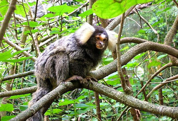 普通狨猴又称“棉耳狨”(学名:Callithrix jacchus),生活在主要分布在南美洲巴西东南部和中部的热带雨林里的一种世界上最小的猴类,主要的生物学特性有:体长19~25cm,尾长27~35cm,体型比松鼠略大,头、脸的模样似哈巴狗或狮子头、头圆,耳大,耳边有一簇白色长发,所以也叫“绒耳狨”,前额有一大块白色印记,脸部没有毛,身体是斑驳的灰棕色,由灰白色、橘黄色和黑色组成层次明显的细条纹组成;雌性正常体重在220~350g、雄性260~450g范围之间;拥有爪状坚硬的指甲被称为翅基片,代替了其它的、哺乳动物的扁平的指甲,使其更好的运动和捕食,而且趾可以握合;胸部有1对乳;后肢比前肢长,牙齿32枚,齿式为异齿型:门齿、犬齿、前臼齿和臼齿,颊齿通常为丘型齿和低冠齿,臼齿呈四方形并有4个较低的锥状突起,适于咀嚼;听觉发达,嗅觉、视觉次之;具双角子宫或单子宫、有发达的盲肠;脸部的皮肤在阳光下会改变颜色、体温也不稳定。