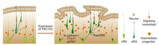 TBC1D3促进皮层沟回形成模式图。TBC1D3通过降低vRG细胞中的N-cadherin引起vRG细胞迁离脑室形成类似oRG的细胞,同时激活Ras/ERK等细胞干性相关信号通路,进而促进此类oRG细胞的增殖,产生更多的oRG或中间前体细胞,导致区域性神经元密度的增加,从而引起小鼠大脑皮层产生沟回。