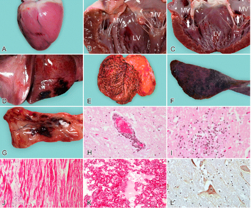 摘要: 自2011年底以来,在华北与地区疑似犬狂犬病病与猪伪狂犬病疫情上升。但犬伪狂犬病病毒(PRV)感染发病在中国知之甚少。在这项研究中,我们研究了犬狂犬病的发病机制。方法: 2011-2013在北京对13条犬死于自然感染PRV的病理变化进行评估。对健康成年犬进行分离PRV病毒BJ-YT株皮下注射实验。犬的组织进行肉眼和显微镜检查和免疫组化分析和犬的血清心肌肌钙蛋白I(cTnI)测定。结果: 自然和实验条件下PRV感染的犬 ,全身性出血和/或充血是最明显的病理变化。主要病变两心内膜和外膜出现瘀点和瘀斑在二尖瓣瓣膜血栓、肺和胸腺出血和脾不完全收缩。在显微镜下,主要的组织病理学表现为全身性出血和充血,非化脓性神经炎(在实验感染犬出现,未观察到在自然PRV感染的犬)。脑干脑炎(自然感染的犬),心肌坏死或渗出,许多淋巴结及器官和组织的淋巴损耗。在脑干和感染犬外周神经节检测到病毒抗原。实验PRV感染有心肌病变的犬血清心肌肌钙蛋白(cTn-I)明显高于无心肌病变的犬。结论: 基于这些结果,我们得出这样的结论:病毒引起的全身出血,外周神经系统病理和/或心脏损伤可单独或共同导致PRV感染犬的死亡。疾病的呼吸道症状是由于心源性病变。关键词: 犬 狂犬病毒 发病机制 心肌损伤 出血 神经炎背景: 伪狂犬病(也被称为"伪狂犬病")是一种由伪狂犬病毒引起的急性、致命的疾病,属于病毒属,在α疱疹病毒亚科亚科疱疹病。猪是主要的PRV宿主,但许多哺乳动物也容易受到感染。认为犬(牧羊犬和伴侣犬),可以通过食用被污染的生猪肉或内脏感染这种病毒。犬狂犬病的临床表现不同于那些猪伪狂犬病。犬初期出现局部皮肤瘙痒,潜伏时间为2-9天。大多数感染的犬出现症状在48小时内死亡。犬的临床症状相似,包括面部皮肤瘙痒、呼吸困难、呕吐、出血性腹泻、水肿、共济失调、肌肉痉挛。然而,一些犬死了没有显示任何典型的症状。犬感染PRV病毒的组织学病变报道很少,组织病理学的研究一直局限于心脏和神经系统。然而,犬PRV感染系统的病理特点不是很好理解。不论什么原因导致心肌细胞死亡或损伤后,心肌肌钙蛋白-I(cTn-I)是一种心肌检测标志物。在损伤数小时内,cTn-I从受伤的心肌细胞释放到循环中,在2 d内达到峰,是随着损伤的持续而不断升高。血清增加的CTn-I可以持续的有效地被检测、监测和量化来评估心肌损伤。自2011年初以来,在中国北方养猪场PRV感染的发病率增加,包括以前接种PRV的猪之间也有发病。这一疫情已波及九多个省、市,包括北京。这个的猪伪狂犬病爆发期间,犬PRV感染发生率同时增加。总的来说,13例犬狂犬病在我们的实验室被检测,包括来自农村地区和北京的城市地区农场的犬和宠物犬。对这13个自然PRV感染犬的病理变化进行了研究,提供了一个更新的系统的PRV病理特点。我们还进行了一个实验性的研究中,犬在实验室条件下感染PRV分离BJ-YT株探讨犬感染PRV的发病机制。结果: 自然感染PRV犬 通过PCR,免疫组化,证实病毒分离,和兔接种试验来证实PRV感染。犬出现瘙痒(13 /13,100%),进行性加重的呼吸急促、困难(11/13、85%),唾液分泌过多(10/13,77%)、呕血(4 /13,31%)、震颤(4 /13,31%)和呕吐(2/13、15%)。,胸部平片观察(4 / 4,100%)没有明显的异常。9/13(69%)犬有吃生猪肉或内脏的历史。总异常记录在尸检报告中,心脏畸形(11/13、85%)通常包括心外膜出血(5/13, 38%,Figure 1A)心内膜出血(9/13, 69%; Figure 1B),心脏出血(3/13, 23%; Figure 1C),心脏血栓(3/13, 23%).局灶性肺出血和/或充血(11/13, 85%; Figure 1D) 是呼吸系统中最常见的表现,一只犬肺气道出现泡沫流体。胃出血(6/9, 67%; Figure 1E) 脾的病理特别均匀,其特征是由众多的深红色到黑色,凸起,柔软,充满各种大小的出血区域 (9/13, 100% ;Figure 1F) 胸腺出血(11/11、100%;两只犬被排除,因为他们的年龄意味着他们的胸腺是无效的;Figure 1G)肾出血(2 / 13,15%)也观察到。其他肉眼病变包括皮下水肿(2 / 13,15%)和胸腔出血(1 / 13,8%)。因为对犬PRV的了解和以往的经验文献是有限的,只有来自13只犬的一些组织显微镜检查。脑干病变是最重要的。在脑干观察到非化脓性脑炎(8 / 8,100%;图1H)由轻度到重度血管周围袖套,和胶质增生和噬神经细胞现象。大脑和小脑的病变是有限的,只有轻度充血(1/5;20%)。轻度和重度出血炎症,嗜酸性纤维状的间质渗出(3 / 6,50%;图1J)是最明显的心脏改变。也观察到中度至重度肺水肿、充血、出血和/或(3/3、100%;图1K).在肝脏的病理变化包括轻度至重度充血(6 / 6,100%)和局灶性坏死(3 / 6,50%)。胸腺显示弥漫性中度至重度出血(6 / 6,100%)和淋巴耗尽(3 / 6,50%)。还观察到不完全收缩的脾脏(3 / 4,75%)。淋巴结显示淋巴耗尽(4 / 4,100%)和出血(2 / 4,50%)。急性肾炎是典型症状,由中度至重度间质性充血(5 / 5,100%)和蛋白液积累在肾小管和胶囊(3 / 5,80%)。实验条件下PRV感染犬: 实验条件下对五只犬接种PRV,潜伏期为87~93小时。所有受感染的犬在发病后31小时内死亡。所有的犬表现出抑郁、厌食、皮肤瘙痒、发声。注射区域一个激烈的,局部的瘙痒持续直到死亡,所有受感染的犬的皮肤出现自我诱导的创伤。小便失禁(3 / 5),进行性呼吸急促加重、晚期呼吸困难(2/5),唾液分泌过多(1 / 5)。对照组在研究期间没有发现异常。大体病理学: 在实验组中, 5号犬在濒死的阶段在感染后第四天(DPI)被静脉麻醉安乐死,而其他四只犬在第五天出现濒死状态时被