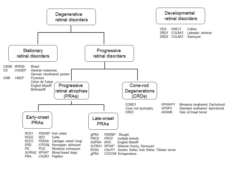 摘要: 遗传性眼病可以说是最好的描述和最好的总结犬的所有遗传性疾病。在临床和分子水平上,科学文献中记录的29种文献同犬遗传性眼部疾病相关。犬已经扮演了一个重要的角色,在鉴定眼发育和功能基因方面以及新型的人类遗传性失明新疗法方面发挥重要作用。犬和人的疾病表型和眼睛结构及功能相似,以及越来越复杂的遗传工具可用于犬。这意味着犬可能会发挥越来越大的作用,了解眼睛的正常运作,通过我们的能力来治疗遗传性眼部疾病。本文综述了与犬遗传性眼部疾病相关的突变。简介: 在临床和分子水平上,遗传性眼病可以说是最好的描述和最好的总结犬的所有遗传性疾病,在写的时候,科学文献中记录的29种文献同犬遗传性眼部疾病相关。在遗传和临床水平上,几个条件已被描述非常好描述,虽然他们的因果关系仍然难以捉摸的;然而,许多这些遗传基础将在接下来的几年里是毋庸置疑的,由于现在犬日益复杂的遗传资源。为什么有这么多的遗传性眼睛疾病在犬中被描述?一个主要的原因是,犬的眼睛是非常方便的,它可以被详细检查,使用非侵入性的技术,在不显著损害视觉情况下使它相对容易检测到异常。在许多国家,在领养前,提供给犬饲养者机会来对犬进行临床筛查计划,在理想的情况下,可知被遗传的疾病。视网膜疾病: 遗传性视网膜疾病是犬最优秀的临床和遗传特征的遗传性疾病。视网膜疾病可以分为不同的方式,当然不是通过唯一的方法来分区他们。然而,大多数的分类方法,广泛考虑到发展的典型阶段或疾病的发病年龄。通常是受影响的细胞和在犬的一生中是否病情逐渐严重,是否它或多或少是固定的。在这里,视网膜疾病已被广泛地分为两大类;在犬的一生中,退行性条件下视网膜由正常发育到退化过程。发育或发育异常的疾病中,视网膜发育异常。应当强调把所有的视网膜疾病归于这两大形式在某些情况下不可避免的过于简化。而少数视网膜疾病都有发育不良和退行性特征。视网膜变性疾病: 在犬的大多数视网膜疾病是退化导致的。一些退化的条件,其特征是随着时间的推移不可避免地增加其严重程度,最终完全丧失视力,其他是通过病理学观察,在生活中没有显著恶化。这两个广泛的临床类别的疾病描述如下渐进性视网膜疾病: 渐进性视网膜萎缩(PRA)和锥杆营养不良(CRD)是两种渐进性视网膜疾病共同表达方式。通过影响视网膜感光细胞导致双侧退行性疾病。渐进性视网膜萎缩: 渐进性视网膜萎缩(PRA)特征是杆感光器功能的初始损耗,其次是视锥细胞功能损伤,由于这个原因夜盲症是大多数受PRA影响犬的第一重要的临床表现。总是伴随明亮的光线下视觉障碍,伴随着的变化特点,通过检眼镜对眼底检查可见。典型的变化包括了视网膜血管衰减,由于视网膜变薄及视神经萎缩毡层反射率增加。许多犬继发白内障的发展,由于晶状体混浊掩盖视网膜导致视网膜电图扫描(ERG)的应用。而大多数的犬表现出同样的眼底异常,基因和不同形式的PRA遗传形式导致这些异常的发展有很大的不同可以大致分为早期和迟发型模式。PRA发病的早期形式: 犬出生后视网膜分化期的研究表明:疾病发病的早期形式通常出现在2和6周。其特征是由发育异常的视杆和视锥感光细胞。四个良好的特点,不同基因的常染色体隐性遗传形式,早发性视网膜变性是杆锥发育不良型1(rcd1),杆锥发育不良型2(RCD2),杆锥发育不良型3(rcd3)和早期视网膜变性(ERD)。rcd1从出生后约25天影响爱尔兰雪达犬直到大约1年时结束,视杆和视锥细胞数量的减少,是由807位密码子编码的磷酸二酯酶β亚基基因(PDE6B)的无义突变引起的,光传导途径的重要成员。这种突变首先是要确定是犬的哪种PRA形式?8个碱基对嵌入816密码子中,导致PRA的发病年龄推迟,犬2-3岁时视觉障碍不被注意到。在杆锥发育不良3(rcd3)影响犬正常杆介导的ERG反应不能出现,感光细胞外节段的不成熟和视杆细胞由于凋亡缺失。突变在3已经证实同人类和小鼠的视网膜变性有关。 而PRA发病的早期形式,rcd1和rcd3,如上所描述的,是第一个在分子水平上描述犬遗传疾病特征的,类似的早期发病突变条件ERD(早发性退化)最近已被确定。虽然已知有神经细胞STK38L的功能和异常感光功能不相关。与这种疾病相关的犬建立这个基因作为类似的疾病在其他物种包括人类一个潜在的候选基因。 不同的早发性PRA形式影响迷你雪纳瑞。组织学上这种疾病在一个非常早期的年龄时是显而易见的,正常的视网膜是接近出生后分化的结果,由于它影响到视杆和视锥细胞,它被称为感光体发育不良病(PD)。这种疾病早期同光传感因子的一个错义突变相关。然而更多的研究已经排除光传感因子的突变。对造成这种疾病的基因和突变鉴定,被称为PRA A型。有证据表明,A型实际上是迷你雪纳瑞中罕见的PRA形式。不同PRA基因形式从品种内分离,该突变尚未确定。 最近,一个复杂的突变,包括一一个碱基对的缺失和6个碱基的插入的组合在PRA早期CNGB1的26个外显子中。基因突变导致移码和一个提前终止密码子。受影响的犬表现出早期缺乏视杆功能,其次是一个缓慢的视网膜变性,表型与小鼠和人类的基因突变CNGB1可比。CNGB1结合CNGA1形成杆环核苷酸门控通道。先前研究表明:CNGB1是视杆细胞外片段CNGA1必须的靶向目标。PRA上述发病的早期形式都是由常染色体基因突变引起