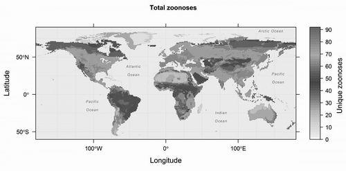 这些地图包括狂犬蝙蝠、携带中东呼吸综合征病毒的骆驼以及超过2000种啮齿类动物等陆生哺乳动物数据。一般而言,源于非人类宿主(人畜共患病)病原体引发的疾病的暴发被认为是不可预测的,但这些地图揭示了若干已被研究的模型。