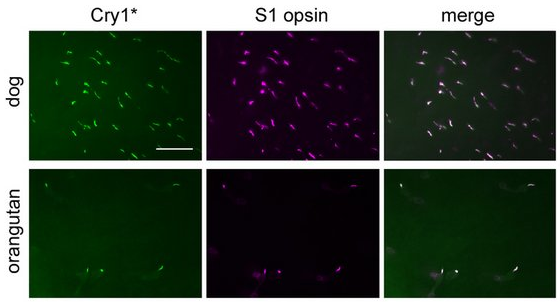 现在,马克斯普朗克研究所及其它几个研究所的研究人员们,已经在90种哺乳动物的视网膜上发现了哺乳动物版本的隐花色素,它被称作1号隐花色素。研究人员们发现这种分子位于像狗一样(比如狗、狼、熊、狐狸和獾)的食肉动物对蓝色光敏感的视锥细胞中。但像猫一样的食肉动物(比如猫、狮子和老虎)的眼睛里却没有它的存在(猫科动物有自己看待世界的独特方式)。研究人员们发现,在灵长类动物中,猩猩、恒河猴和食蟹猕猴等的眼睛里也有1号隐花色素。研究的细节被发表在《自然科学报告》上。