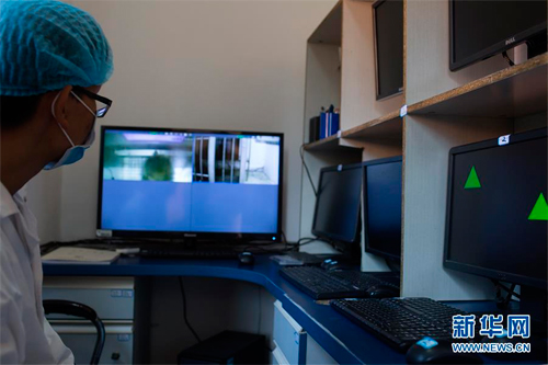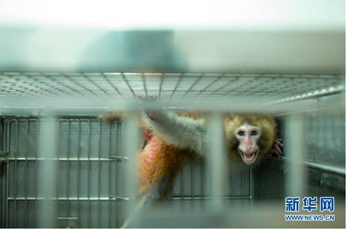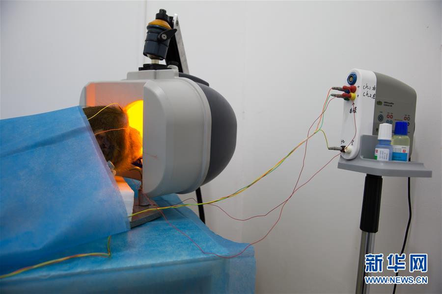 中科院昆明动物研究所工作人员在进行猕猴短时空间记忆实验(12月10日摄)